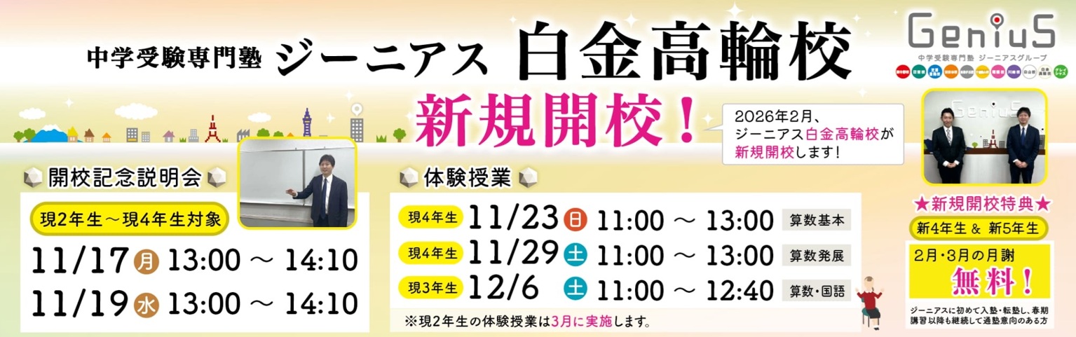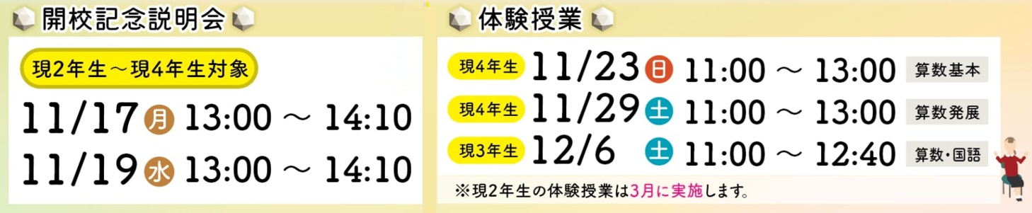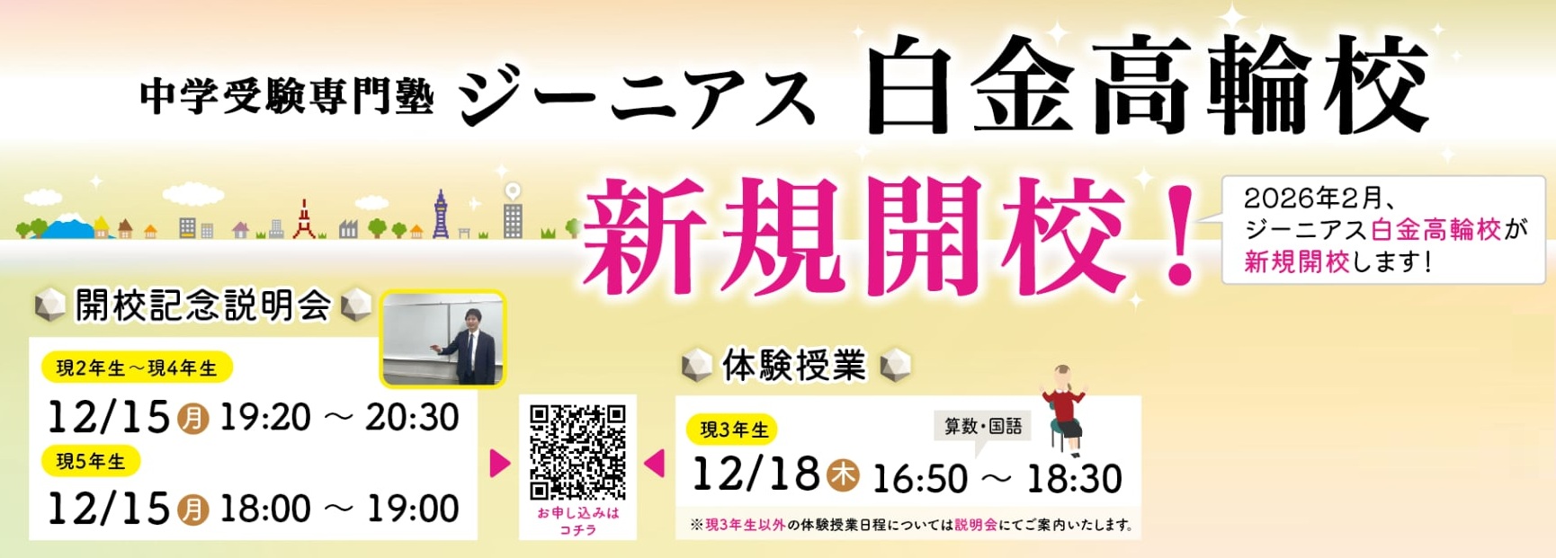 | メールにてお問い合わせください。 【外部生の新規お問い合わせについて】学年、氏名、電話番号、住所、小学校名、入塾検討中の校舎を明記してください。2年生のお問い合わせは受け付けておりませんが、開校記念説明会への参加は可能です。 |